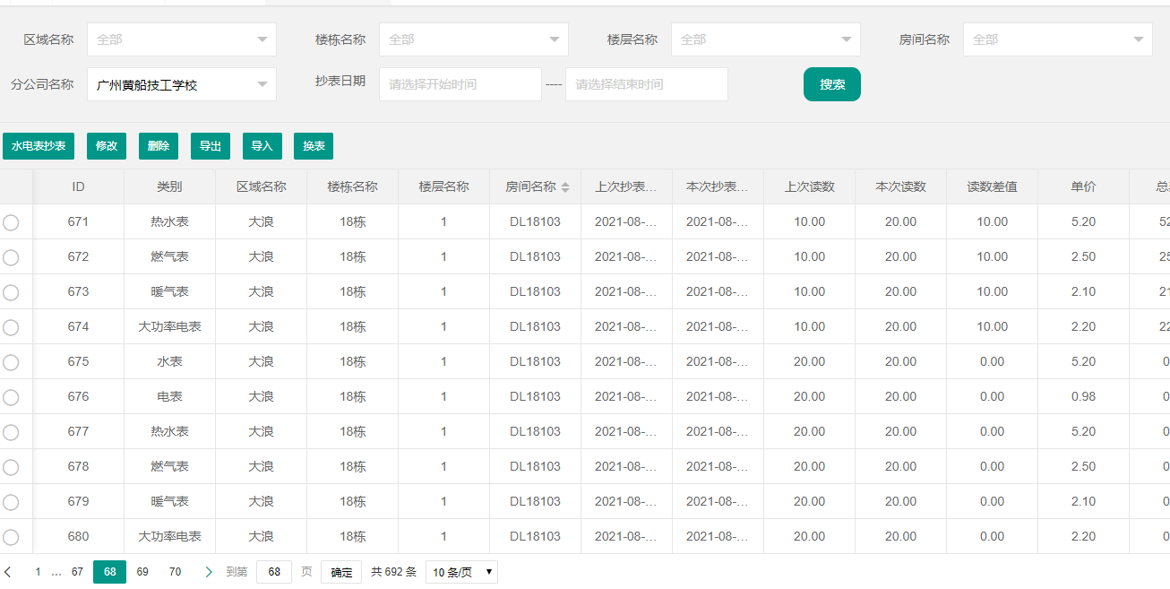 (1)水電表抄表,即對每個房間的電表和水表進行抄表記錄,記錄本次抄表水表讀數(shù)和電表讀數(shù),然后得到房間的水表和電表兩條數(shù)據(jù)。