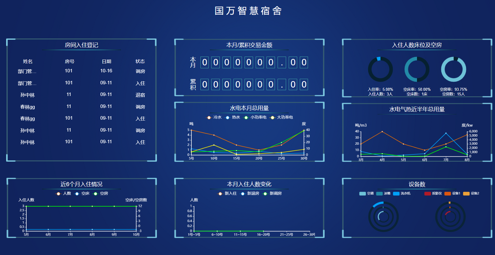 您還能通過可視化數(shù)據(jù)展示大屏,在主要管理區(qū)域展示房間入住退宿、本月或累計交易金額、水電本月的總用量、入住人數(shù)床位及空房、水電氣近半年總用量等情況,直觀的看數(shù)據(jù)實時動態(tài),任何時候都能迅速了解宿舍基本情況。