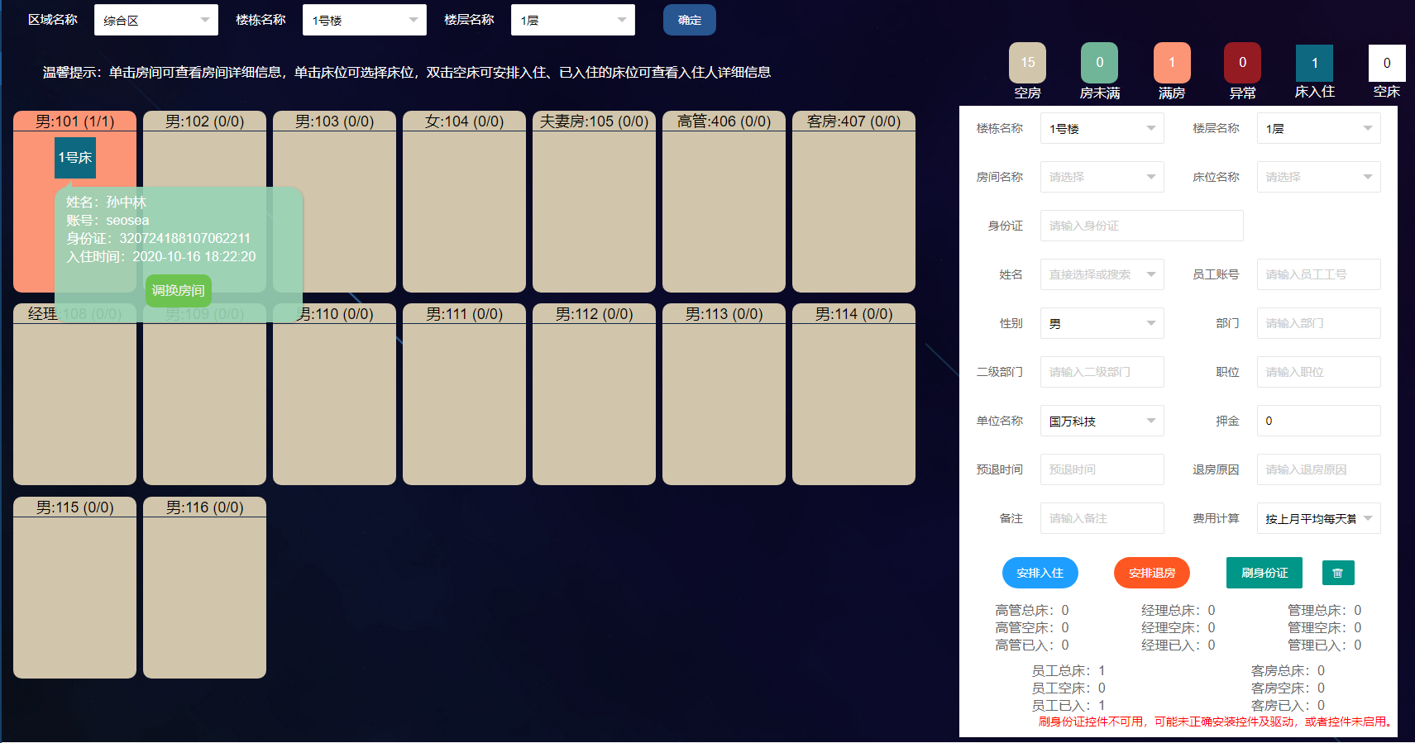 國萬的宿舍系統(tǒng)還可與門禁、通道集成等模塊實現(xiàn)門禁、通道的授權(quán),授禁以及刷卡記錄的采集;同時實現(xiàn)職工或?qū)W生晚歸和夜不歸宿的統(tǒng)計;此外,您還可以進(jìn)行水電等情況的查詢。